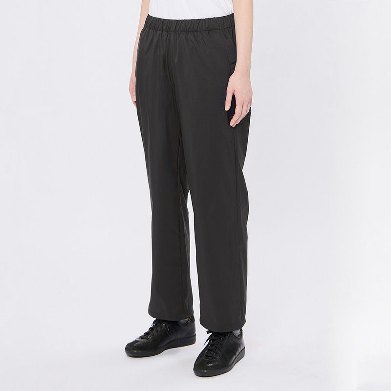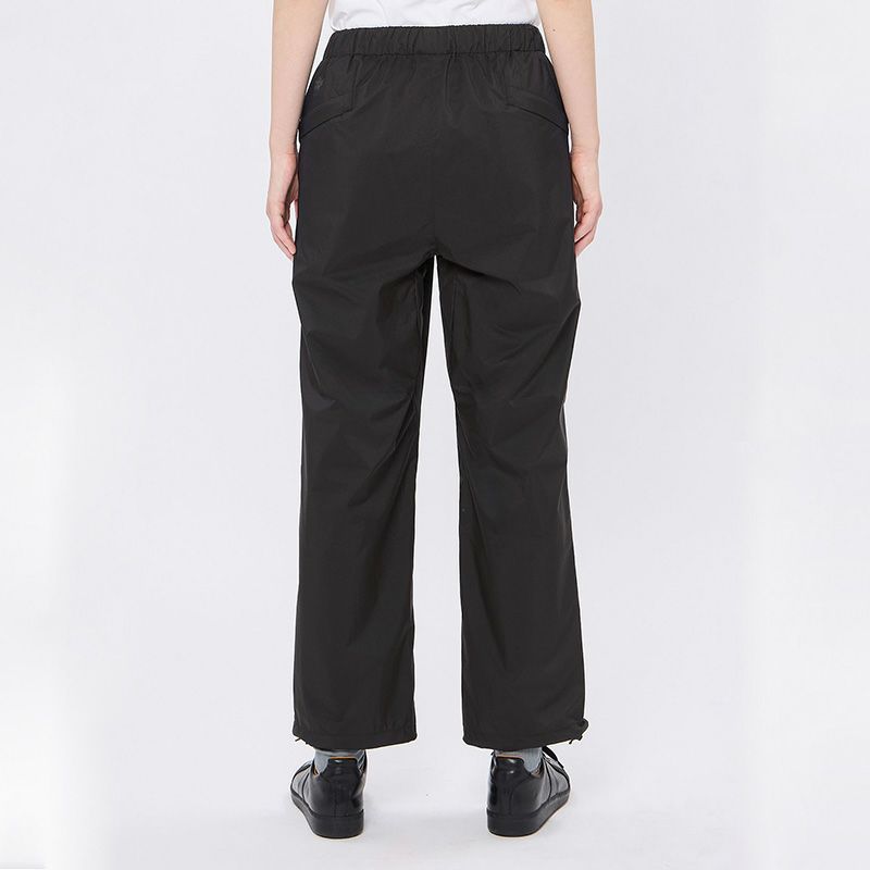 ややゆったりと仕上げながら、大人がすっきりとした印象に着こなせるシルエットに。フルレングスで、裾に配したドローコードでフィット感やシルエットの調節ができます。ウエストは、ゴム+スピンドルでリラックス感のあるイージー仕様。後ろ身頃には、切り替え線を利用したファスナー付きポケットを配置。腰ポケットの袋布は、通気性の高いメッシュで快適性を高めています。