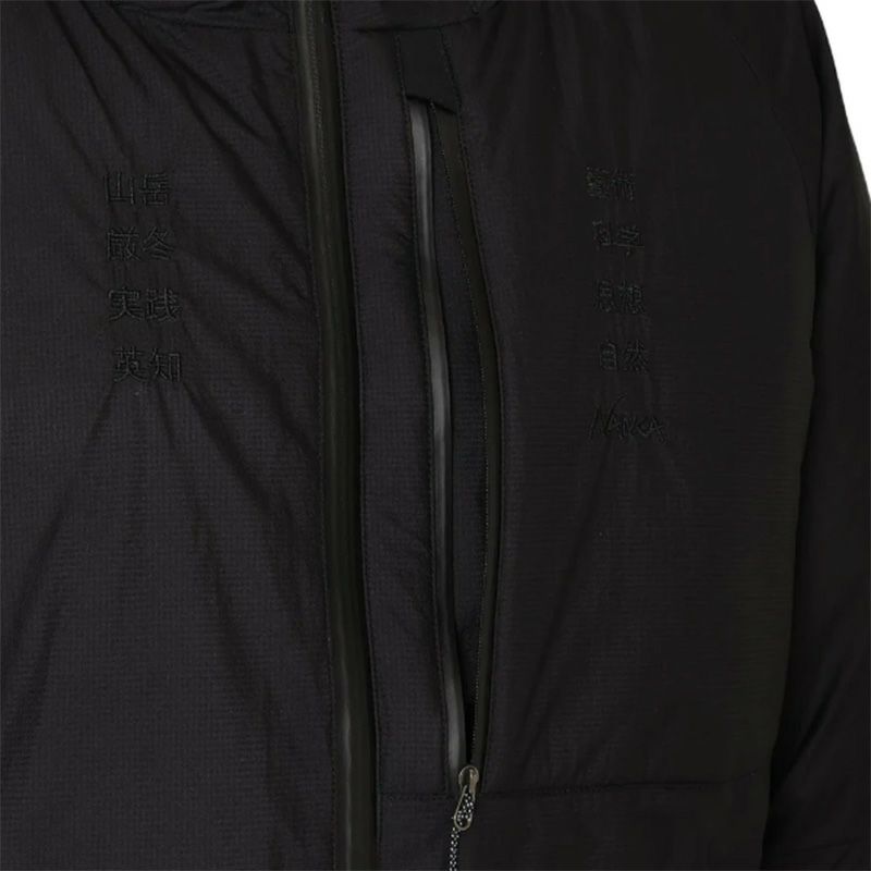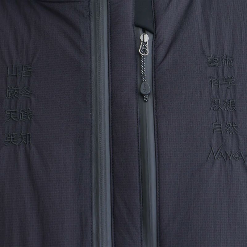 森羅万象を意味する「藝術科学思想自然」を左胸に、 右胸にはNANGAの30周年に渡る足跡を讃える「山岳厳冬実践英知」をボディ同色の刺繍。ナンガとタコマフジのダブルネームらしいデザインに。