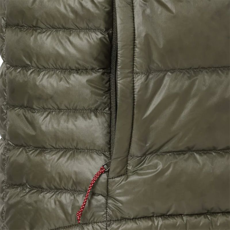 表裏生地にはリサイクルナイロン、羽毛には650FPのリサイクルダウンを使用したエコフレンドリーモデル。特に、10dnというとても薄手で柔らかな着心地はダウンをふわりと感じ、暖かさを保ちます。また、薄手での柔らかな生地感で、コンパクトに畳めることで持ち運びも容易。