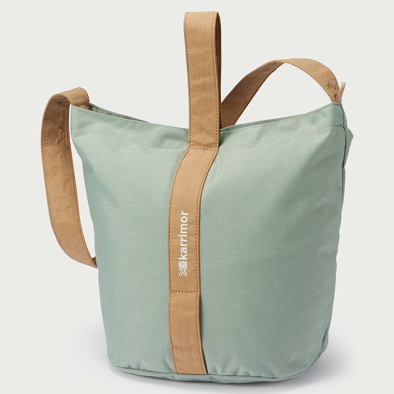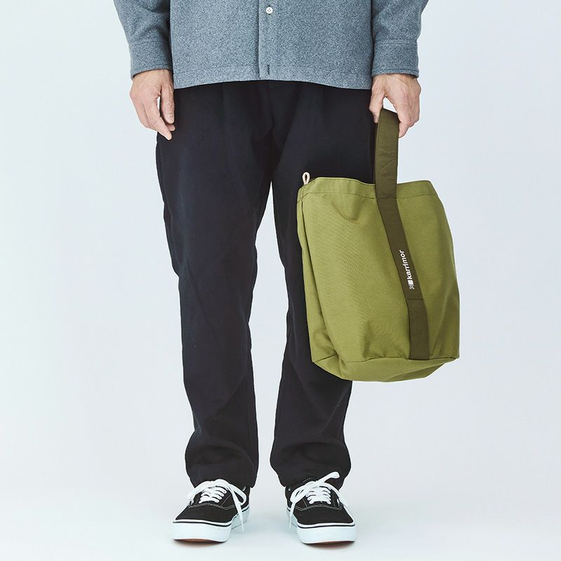 ハリ感のある生地とシワ感のある生地のコンビネーションの風合いが魅力のバケツ型シルエットのトートバッグ。