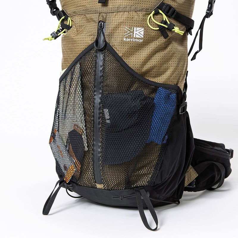 ストレッチメッシュを使用したポケットを両サイドに配置。 小物の携行はもちろん、サイドコンプレッションを利用してポールやパックロッドの収納に役立ちます。