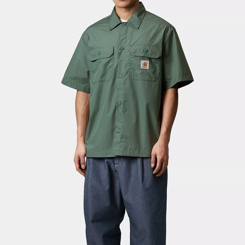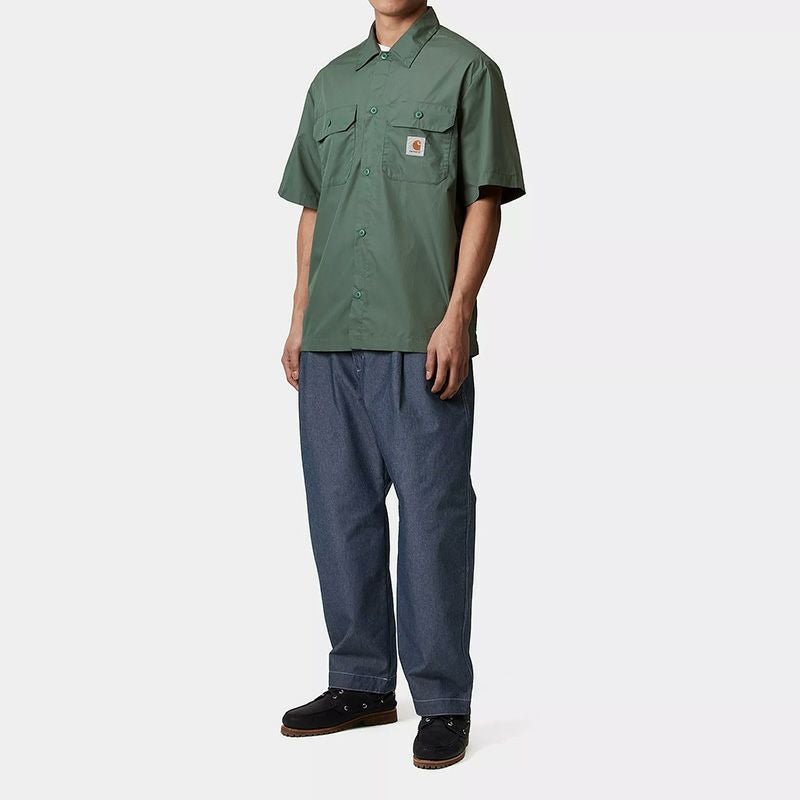 軽量なポリコットンツイル素材を使用したショートスリーブクラフトシャツは、バックプリーツが特徴で、ゆったりとしたフィットを強調しています。フラップとボタンで開閉する2つの胸ポケット付き。左胸のポケットには、カーハートWIPのスクエアラベルがあしらわれている。
