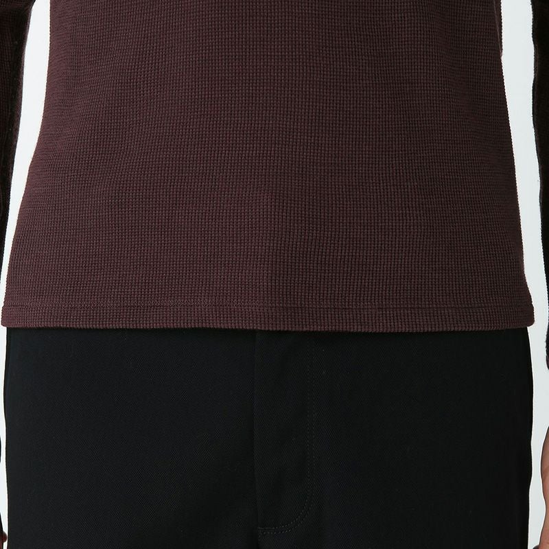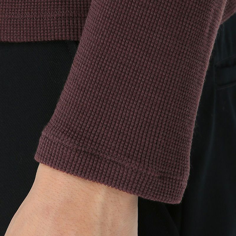 主素材としてメリノウールとリヨセルを組み合わせ、天然由来の繊維で仕上げたプラスチックフリーの生地を採用。メリノウールの心地よい暖かさや調湿性などの機能性があるのはもちろん、リヨセルの特長であるサラリとした風合いや、乾きやすさを備えているのも魅力です。1枚でも着やすいしっかりとした厚みをもたせつつ、凹凸のあるワッフル構造で編み上げることでさらりとした肌触りに。ワッフル編みは衣服内の熱もこもりにくい特性があるため、快適な着心地です。