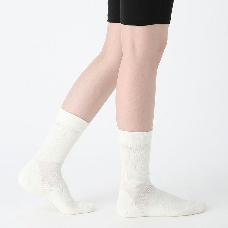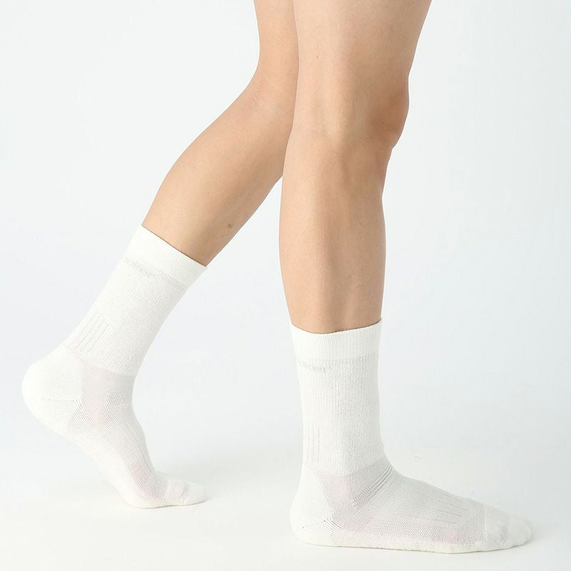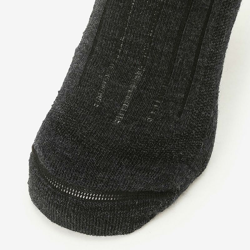 メリノウールにナイロンとポリウレタンを混紡し、摩耗などに対する強度と伸縮性を高めた生地を使用。さらに、部位により編組織を変えることで、快適性が向上。レッグ部分とボトム部分にクッション性がある裏パイルを採用しており、衝撃を吸収し、足の負担を軽減。甲部分は薄手の生地で通気性を確保しています。