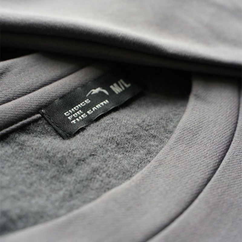 使用しているウールはノンミュールジングウールで、裁断時の余剰生地やタグ類もリサイクル素材を活用するなど、製品全体でサステナブルな設計。