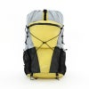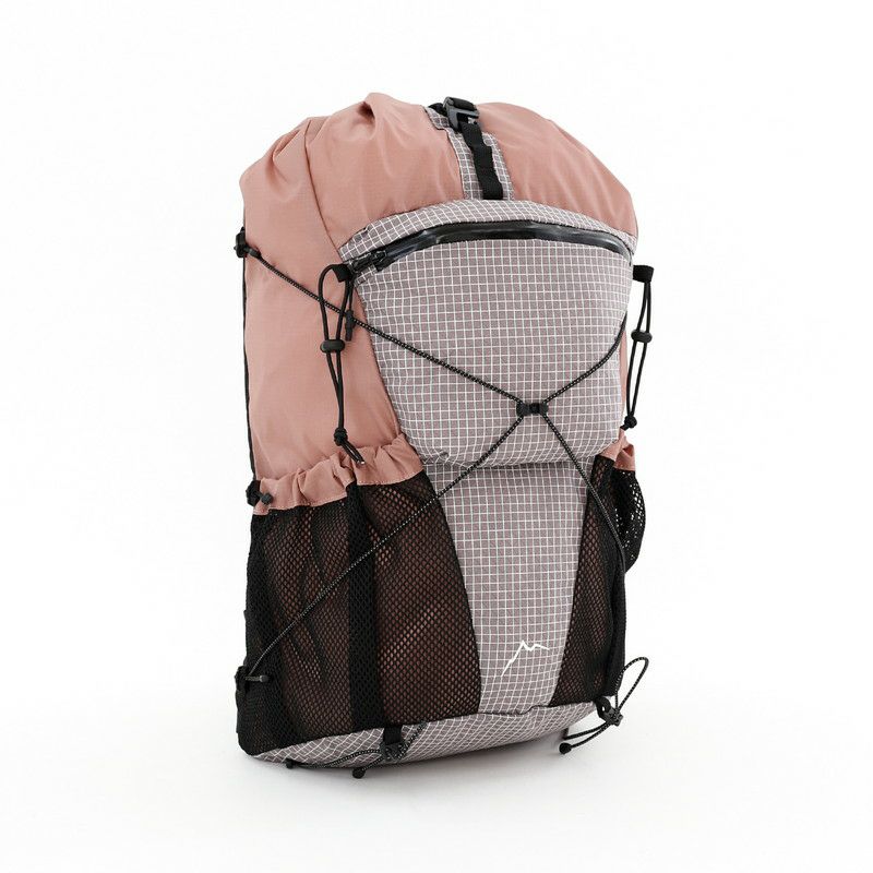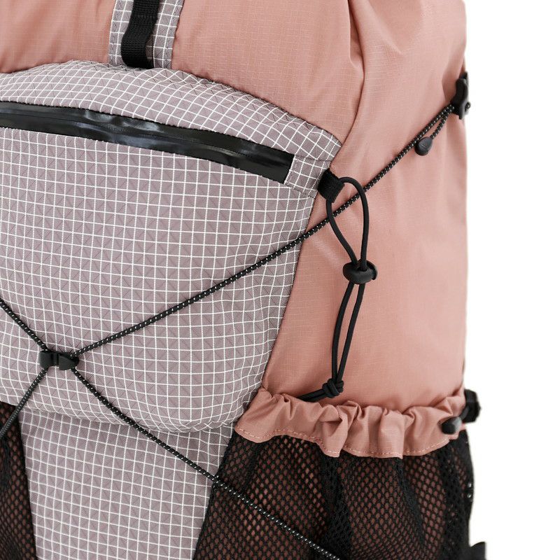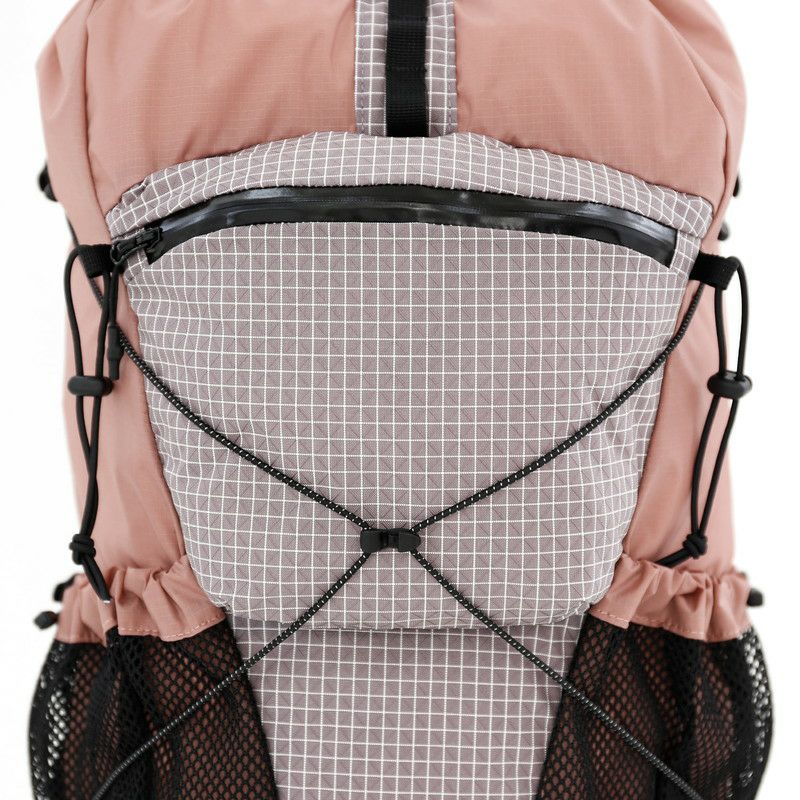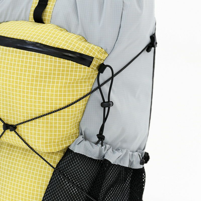 フロントのジッパーポケットや両サイドのメッシュポケットには小物やボトルを収納でき、上部のバンジーコードを使えばトレッキングポールや傘などもスマートに持ち運べます。