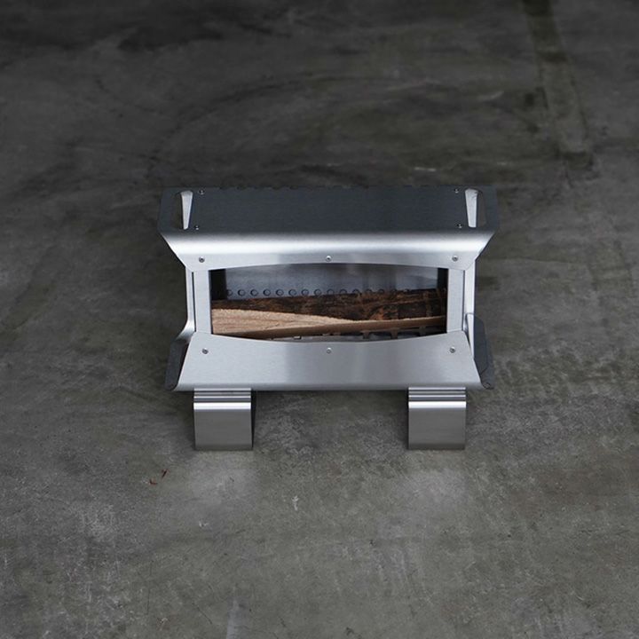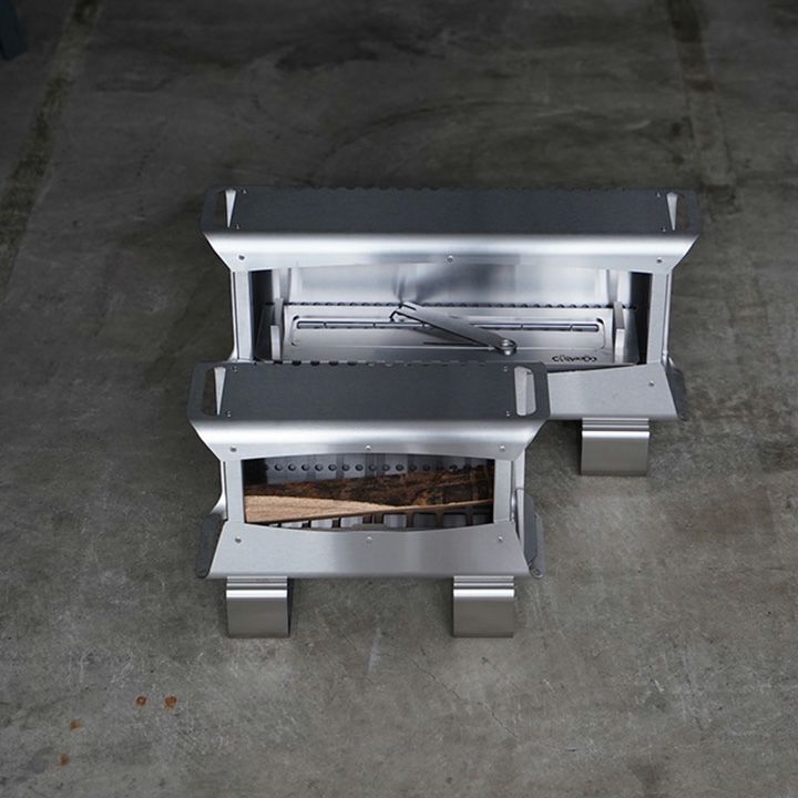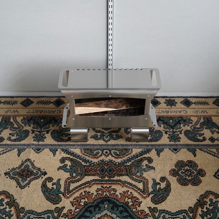 背面部と底面部を外殻と内殻の2重構造にして燃焼効率をよくしています。そのため灰残りが少ないです。火の周りをケースで覆っているので火の粉が飛びにくい。正面に輻射熱が向くように特化しているので足元から暖かい。天板の熱を利用して調理を楽しむことができます。左右の下面にペグ等で固定する穴を設けています。使用後は水で丸洗いできます。