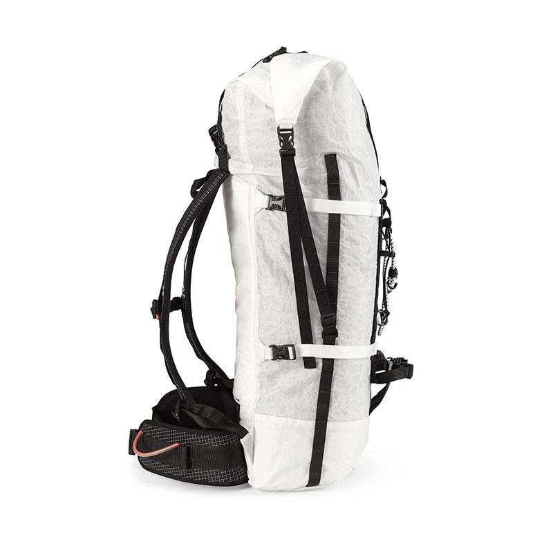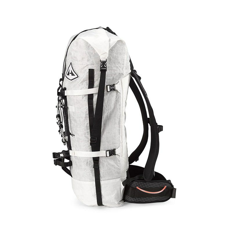 ギアループとアイスクリッパースロットを備えた取り外し可能なヒップベルト。Dyneema® を使用した Hardline、二重密度1/8インチクローズドセル硬質フォーム、1/4インチクローズドセルフォーム、スペーサーメッシュを使用して構築されています。