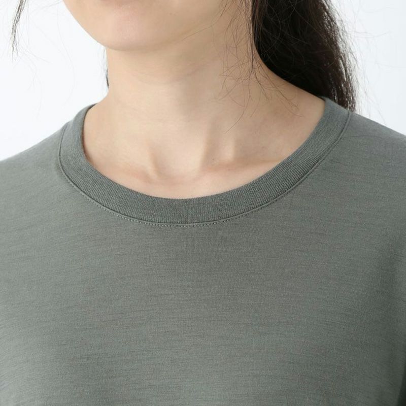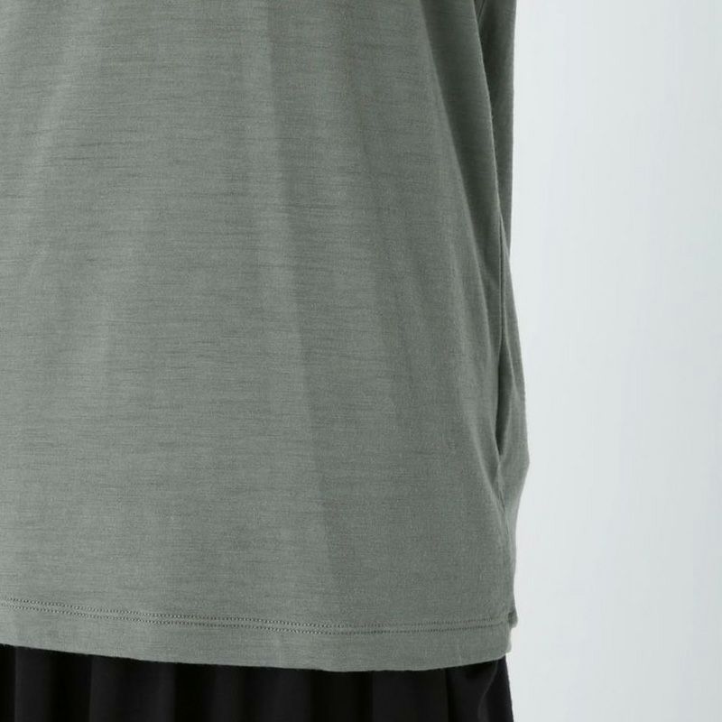 襟ぐりはメリノウールのリブ仕様で、インナーとして重ねやすい厚みと縫製を採用。メリノウールの優れた機能性を生かしながら、普段のコーディネートに使いやすい雰囲気に仕上げました。