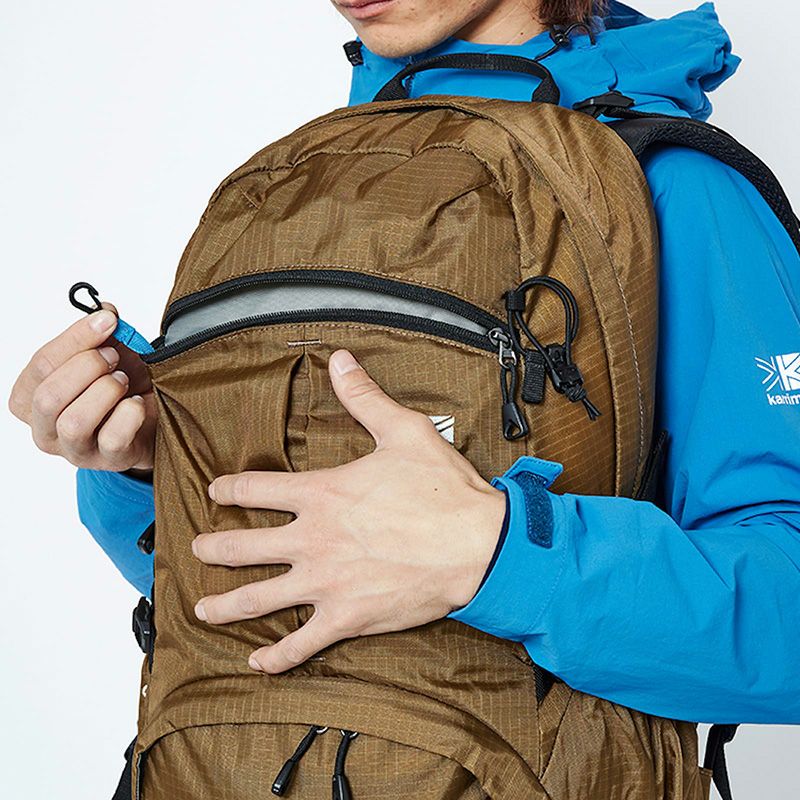 通気性の高いバックパネルを持ち、内部のジッパーで本体を上下2分割にできる構造。シンプルなデザインながらもポールキャリアやチェストストラップなど豊富な装備でデイハイクから日常使いまで幅広く対応。