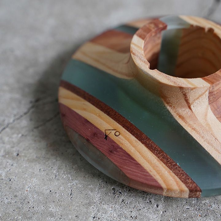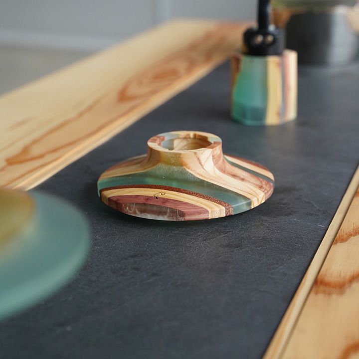 通常のインテリア、プロダクトに使われる木材だけでなく、KI-noではデザイナー、職人が山を守る杣人と共に山に入り、普段見向きもされない木、動物に食べられた木、普段では木材プロダクトとしては不向きな木材も素材として選定。