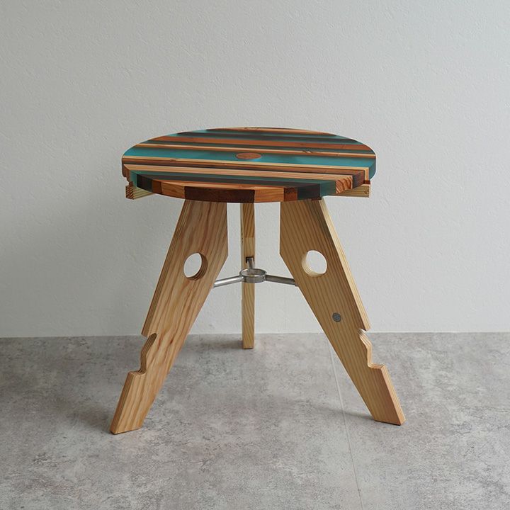 木材とレジンをストライプに組み合わせ、天板と脚部の中央にGoal ZeroのLIGHTHOUSE microを装着することで、唯一無二の照明になるテーブル。