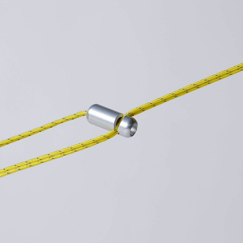 コードにフックを掛けスライドさせることで簡単にテンション調整ができます。テント内のループや、木・ポールに取り付けたり、ヘキサウルトラタープのポール間でランタンを吊るすハンガーとしても使用可能。吊るす対象をビーズで挟みこむことでしっかりと固定できます。長さ約3.6m。