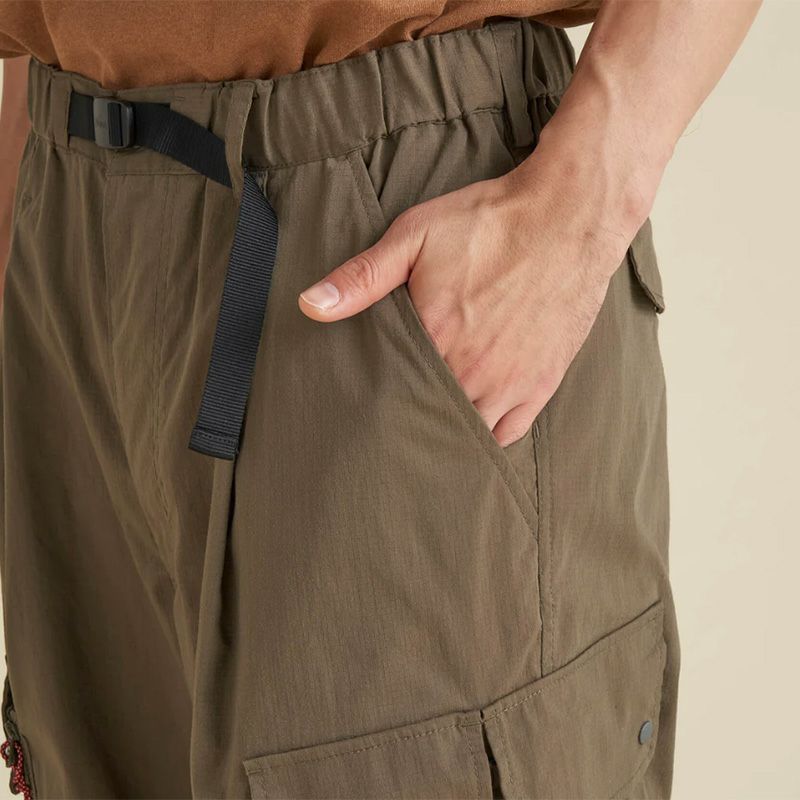 大小様々なポケットを7か所を配置され、収納力に優れたカーゴパンツ。ウエストのウェビングベルトを設けることで、ウエスト周りを簡単に調整可能。裾のドローコードを絞ることで、シルエットの変化が可能