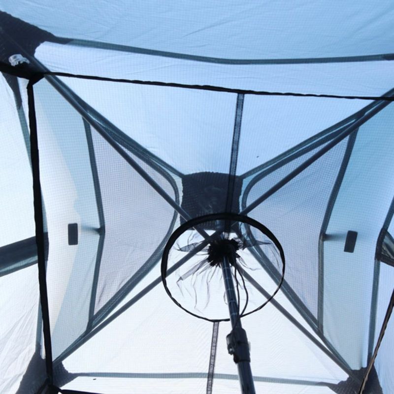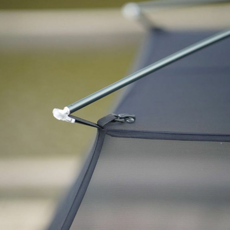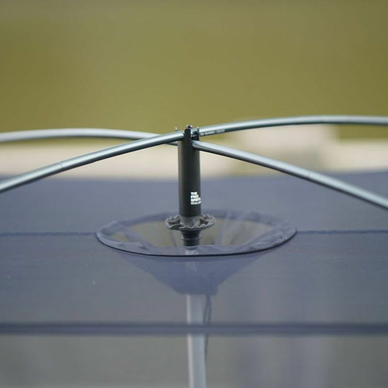また、キャンプ地に程よい木があれば、トップを木の枝から吊るすことで、中のポールを省いて設営することも可能。