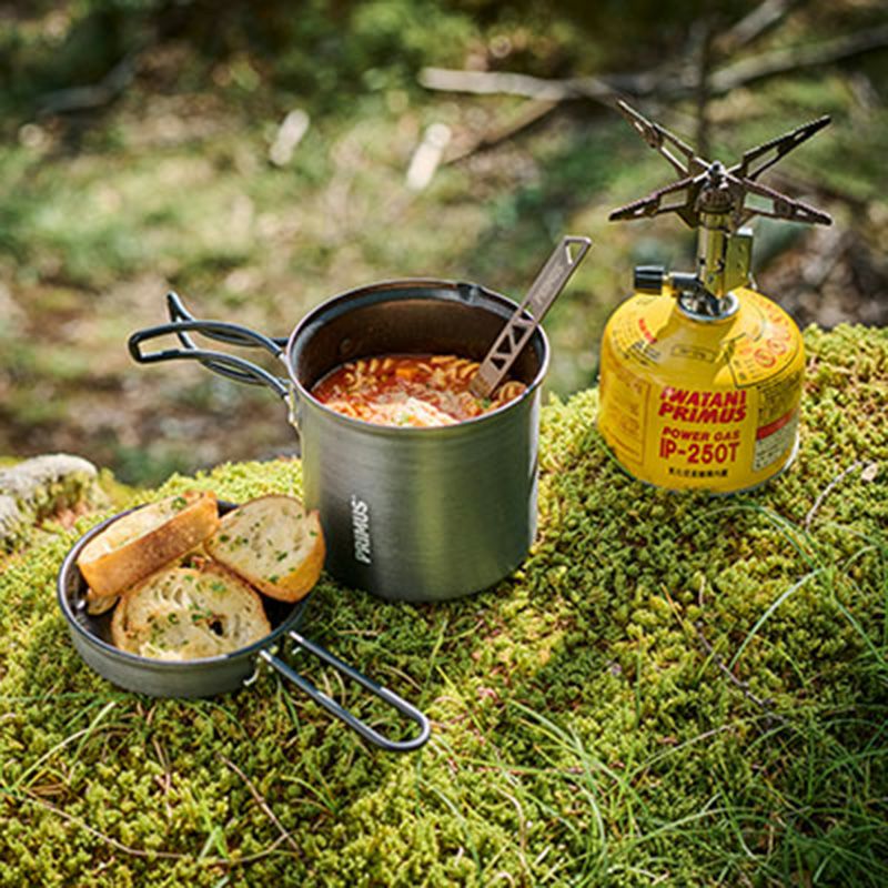 250サイズのガスカートリッジと小型バーナーを一緒に収納することが可能なクッカーです。 蓋と鍋の内側にはノンスティック加工を施し、蓋はミニフライパンとしても使用が可能です。