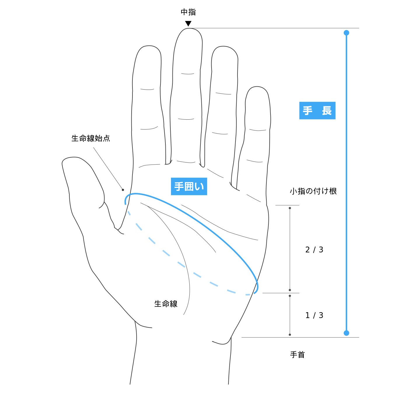 ・手 長:手首部分付け根から中指の先端までの距離を指します。