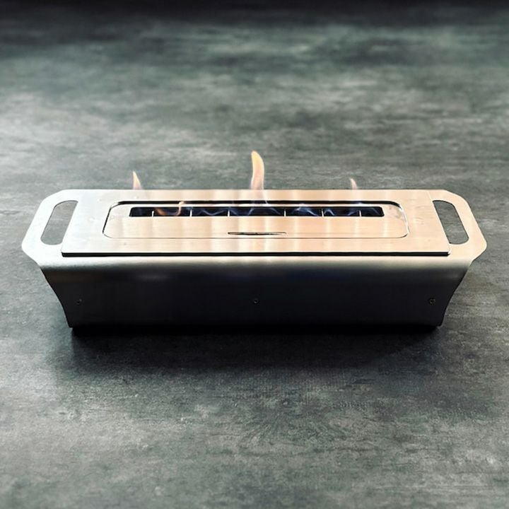ユニット本体を取り外し平らな場所に置きます。本体上部の開口からバイオエタノールを注入します。(最大1.4㍑ 庫内丸穴下限がMAX位置です。)スライド蓋を閉め、お好きな場所に設置します。スライド蓋を開けて長ノズルのライター(点火棒等)で点火します。スライド蓋をお好みに調整します。点火後15分から20分程度で燃焼が安定します。 消火はスライド蓋を閉切ると窒息し消火します。