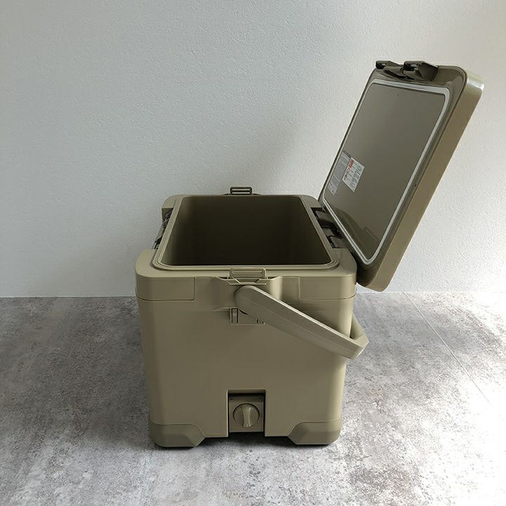 簡単操作で開閉できる便利な水栓。クーラーボックスをひっくり返さず、 手を濡らさずに水抜きできます。ヒンジ構造の為水栓を失くす心配もありません。
