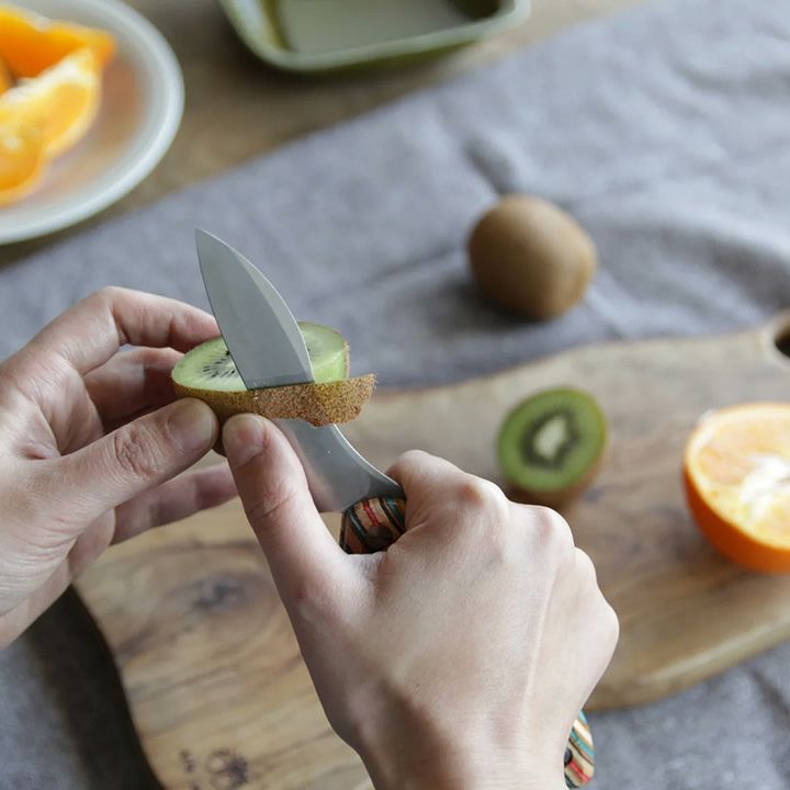 柄の部分には天然の木材の単板に樹脂を含浸させ重ね合わせ、高温高圧で圧縮することで高い強度を持たせた積層強化木を使用。湿気に強く高い撥水性を持つ一方、質感が良く、手になじみやすい特徴を持っています。
