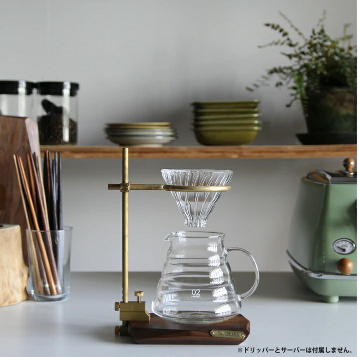 ドリッパーを装着する真鍮製のリング部は、 上下、前後に可動することができるので、 サーバーはもちろん背の高いピッチャーや マグカップ、グラスなど様々な大きさ、 高さに対応することができます。