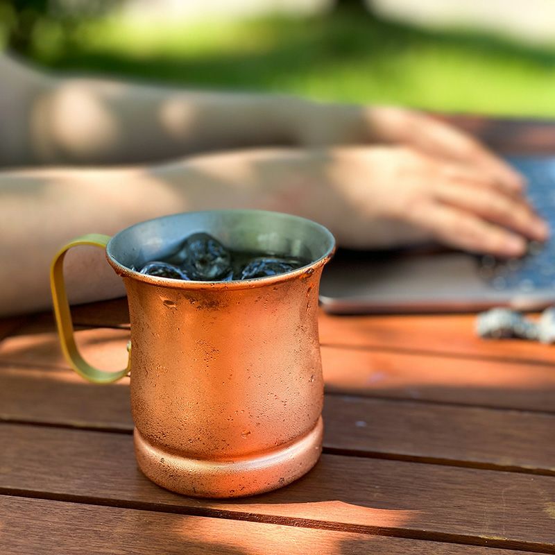 じりじりと焼ける日差しの中や、蒸しかえる夜でも、銅製のマグは注いだ瞬間から飲み物と同じキンキンの冷たさに。