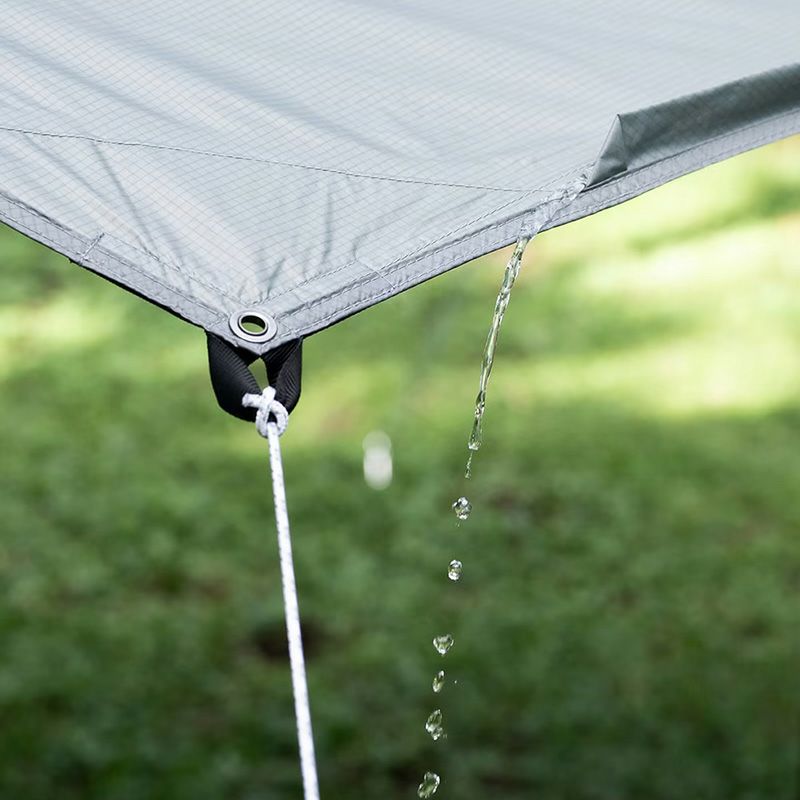 生地の裏面にシルバーカラーのPUコーティングを施すことで光の透過を極限まで抑え、濃い影を作り出します。フチには雨どいが付いているので、コーナー部分から雨をスムーズに排出できます。