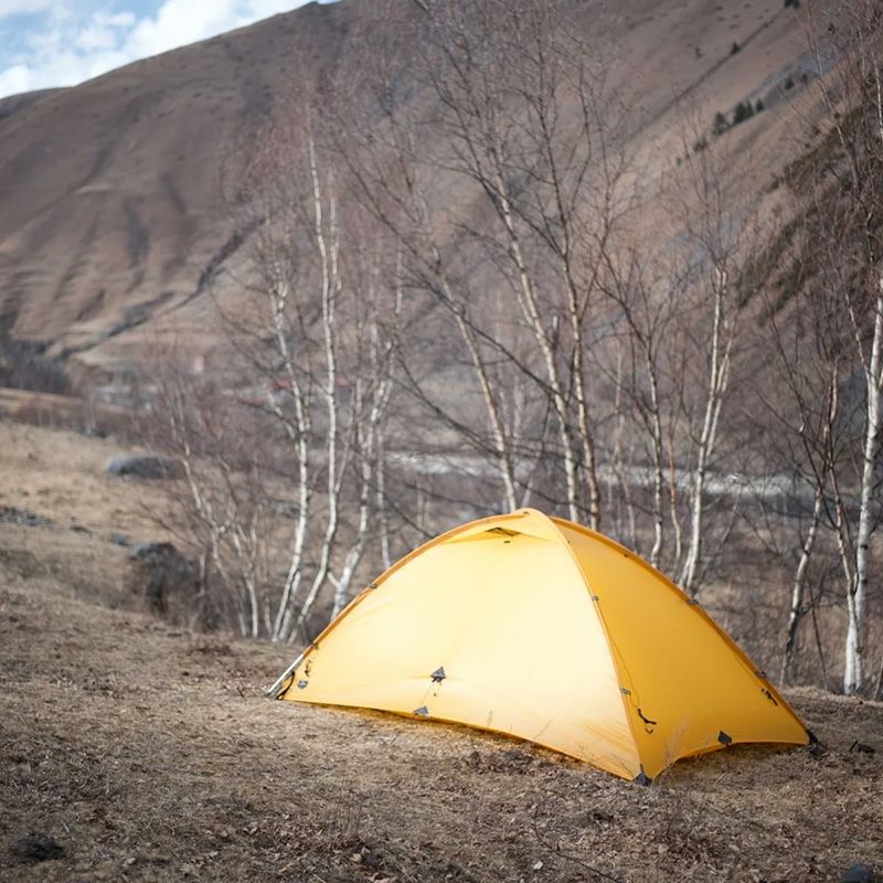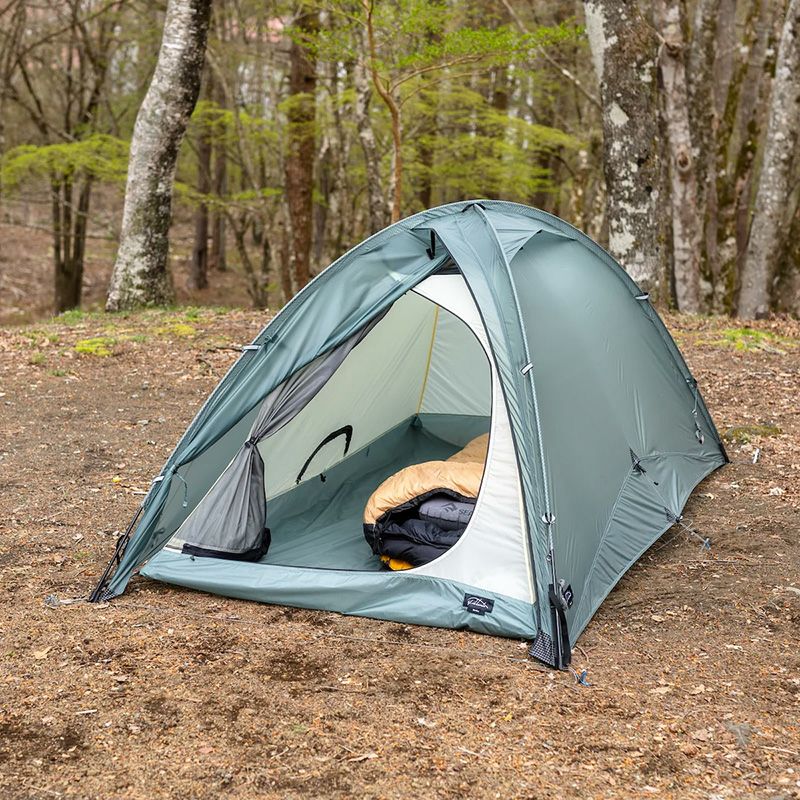 クロスポール構造の15Dリップストップシルナイロンの軽量なダブルウォールテントで、Pretentsでは珍しい短辺に入り口を設けたデザイン。