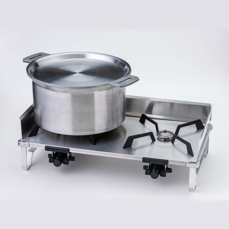 ステンレスヘビーポットGORA(別売)がすっぽりと中に収まります。鍋ヅル(別売)は着脱式。