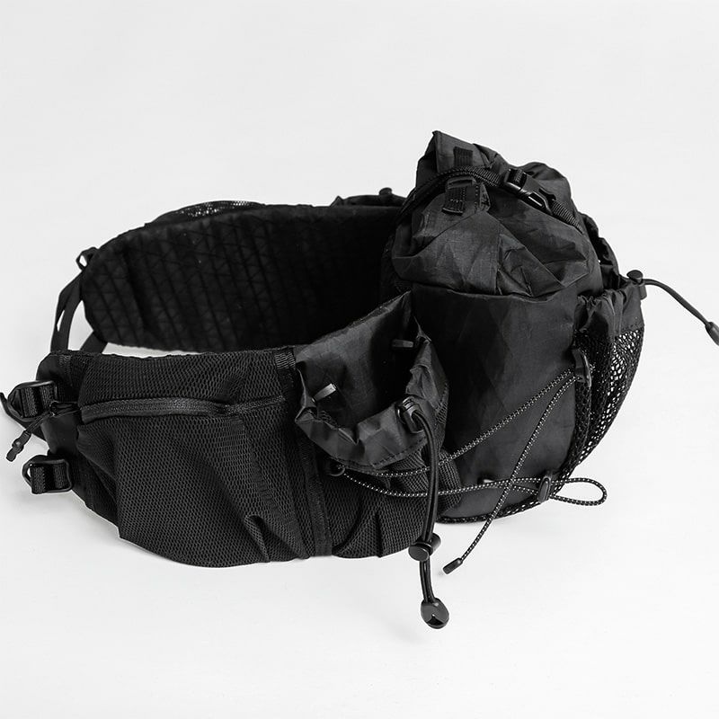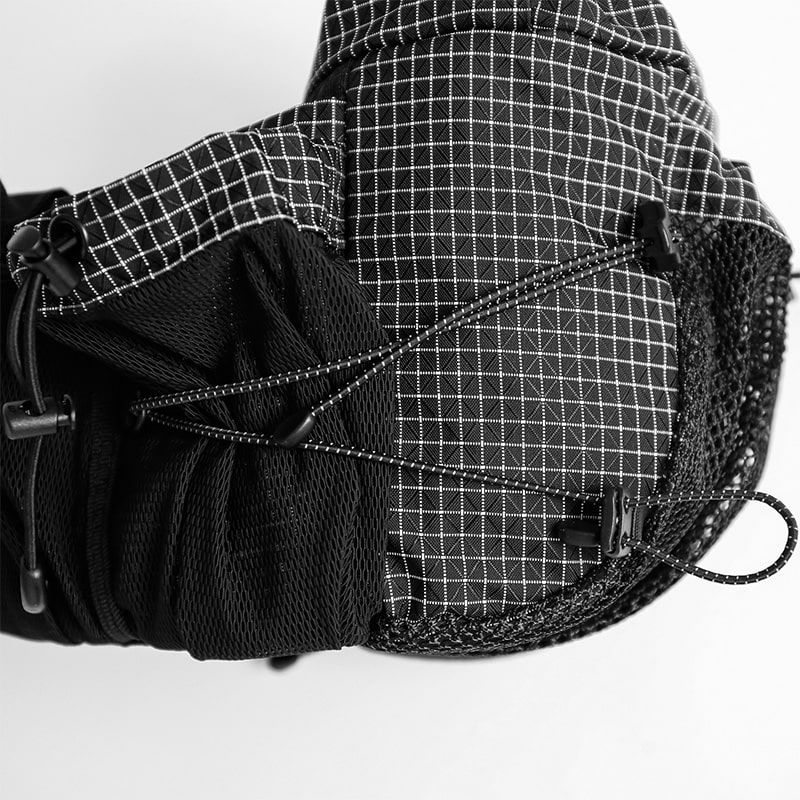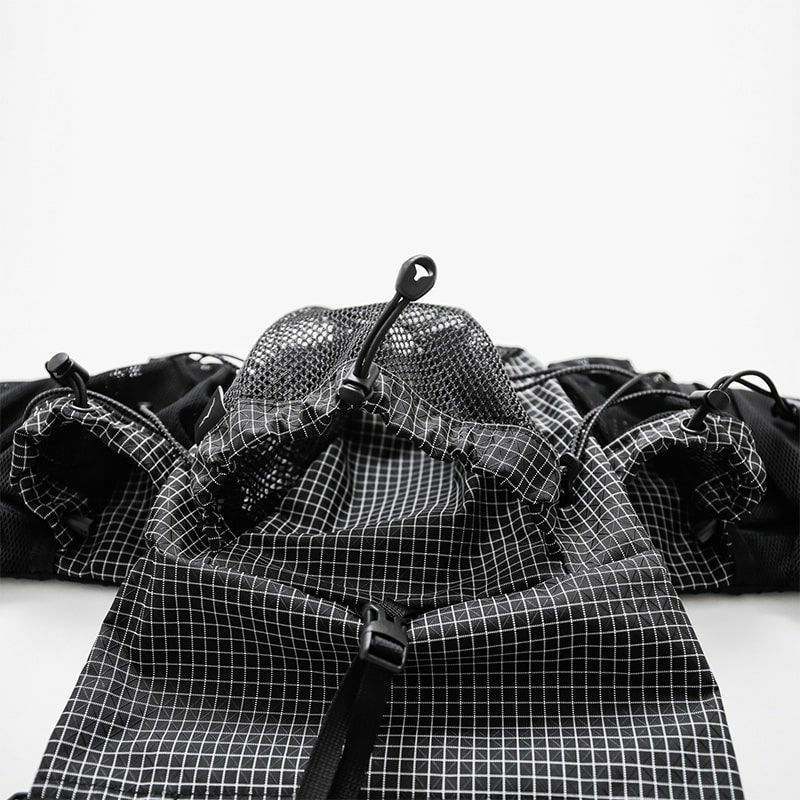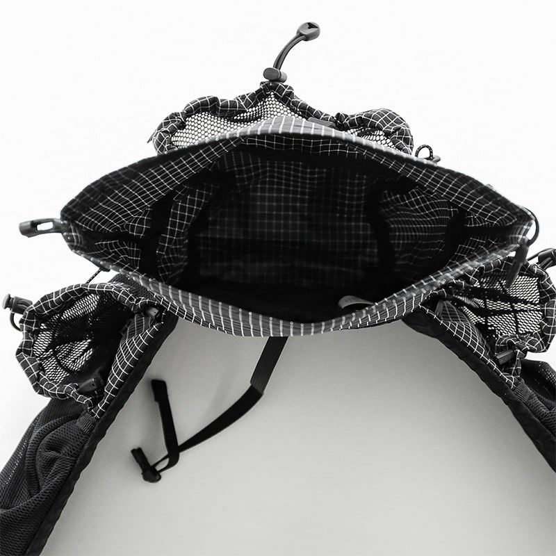 ロールトップのメインスペース、外側にメッシュポケット、2か所のボトルポケットと2つのファスナーポケットが備わっています。ボトルポケットはダブルコードロックを採用しているため、コードで2か所の固定が可能。走っている際もボトルの揺れを抑えます。