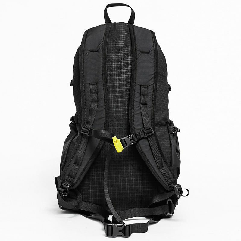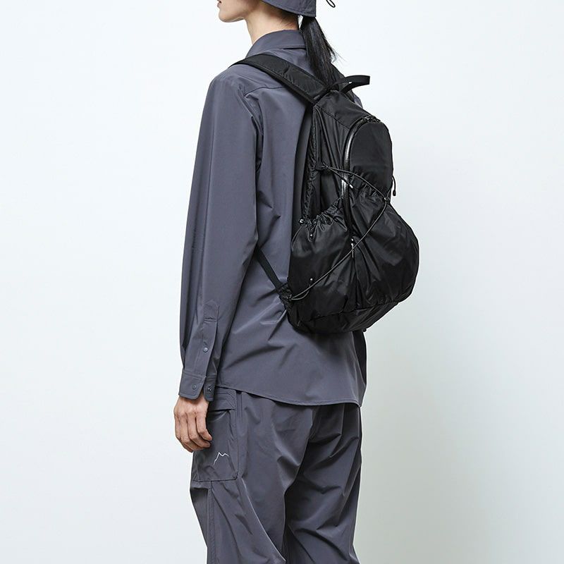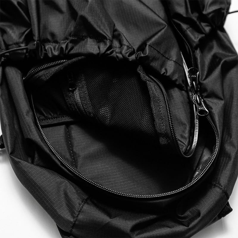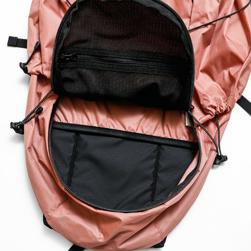 外ポケットで包むようにデザインされた約15Lのバックパッ。防水仕様のダブルジップファスナーで、左右どちらからもメインスペースにアクセスできます。