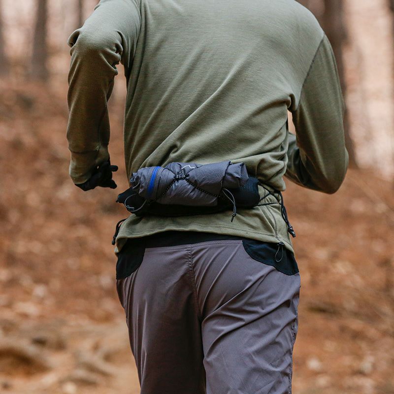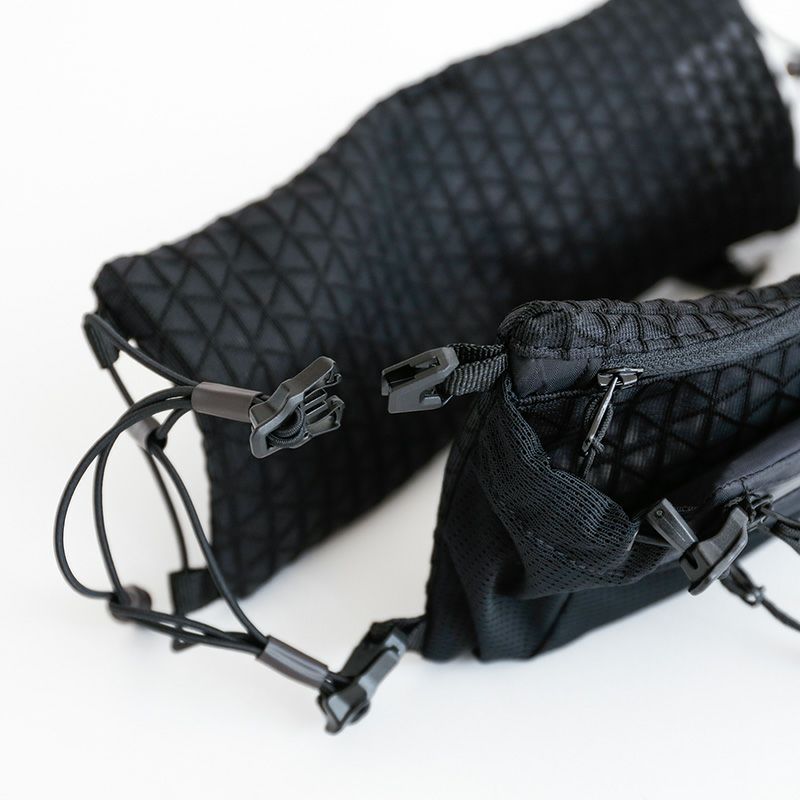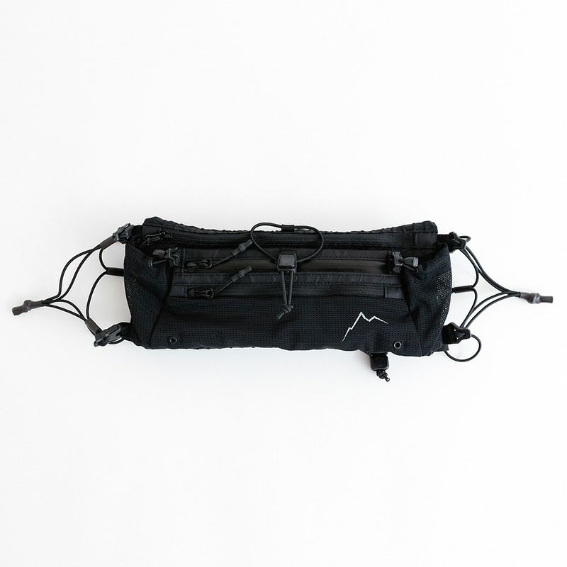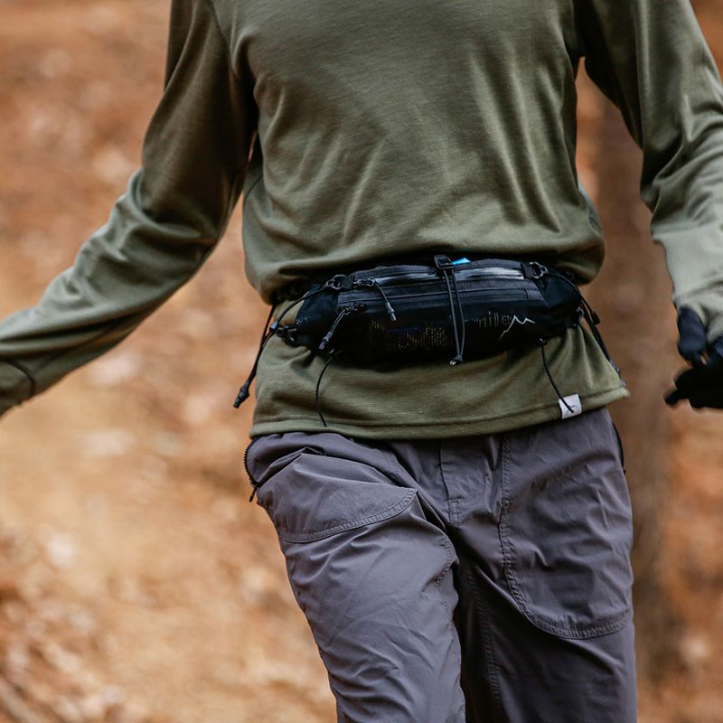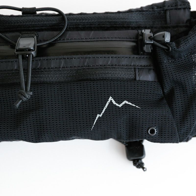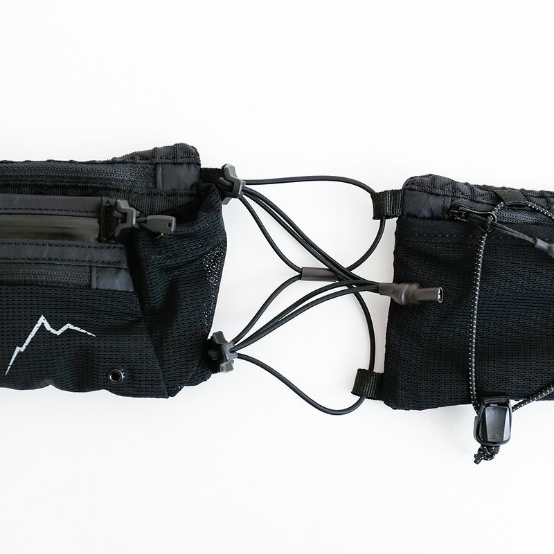 「GTD Belt」は、トレイルラン用にCAYLで開発されたアイテムになります。前後に合計6つの収納スペースを備え、ランニング中の持ち物を効率的に整理できます。右側のバックルで簡単に装着でき、腰にしっかりフィットするため、走行中も安定して持ち物を運ぶことができます。
