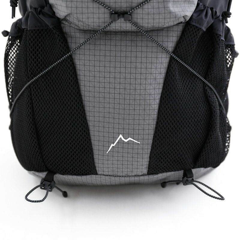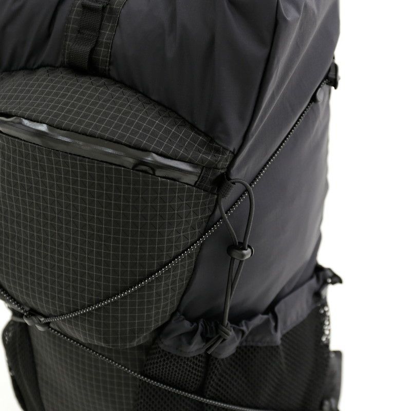 フロントのジッパーポケットや両サイドのメッシュポケットには小物やボトルを収納でき、上部のバンジーコードを使えばトレッキングポールや傘などもスマートに持ち運べます。