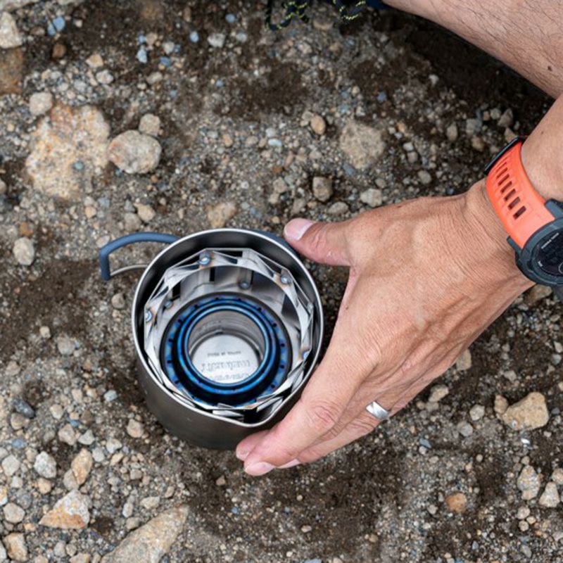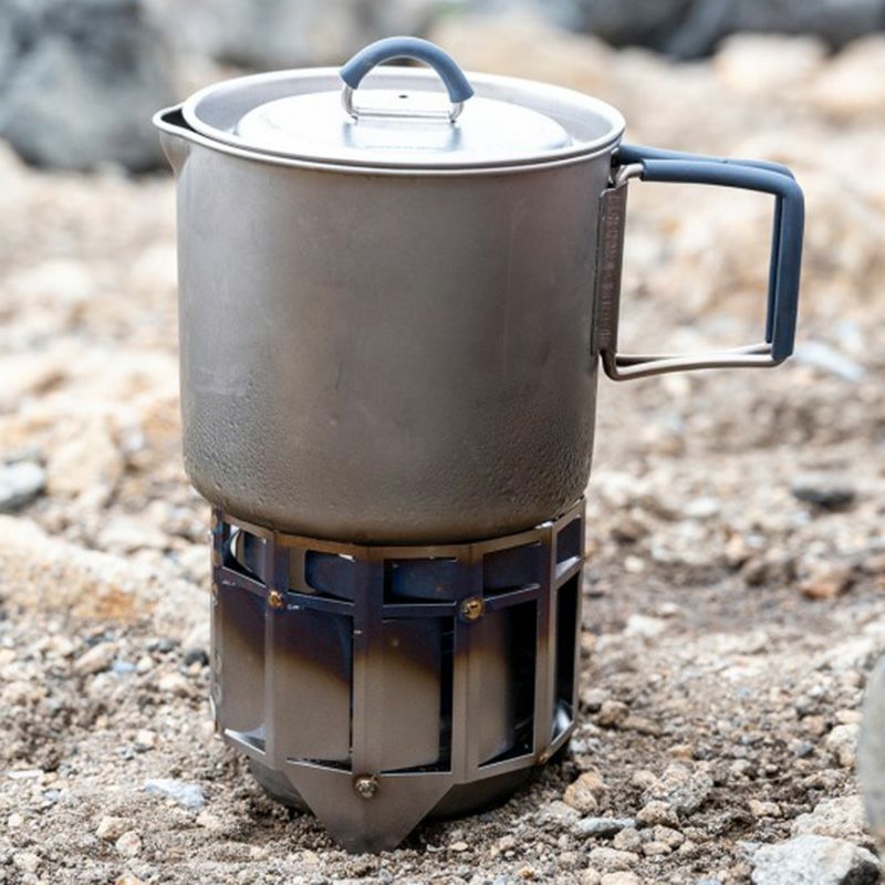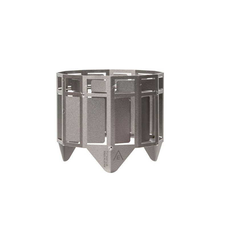 燃焼工学を用いて綿密な計算のもとに配置されたフィンが炎を旋回させ加熱効率を高めます。組み立て要らずの構造でアルコールを入れて火をつけクッカーを置くだけ。組み立ては必要なく、アルコールを入れて火をつけるだけ。ゴトクさえ不要です。