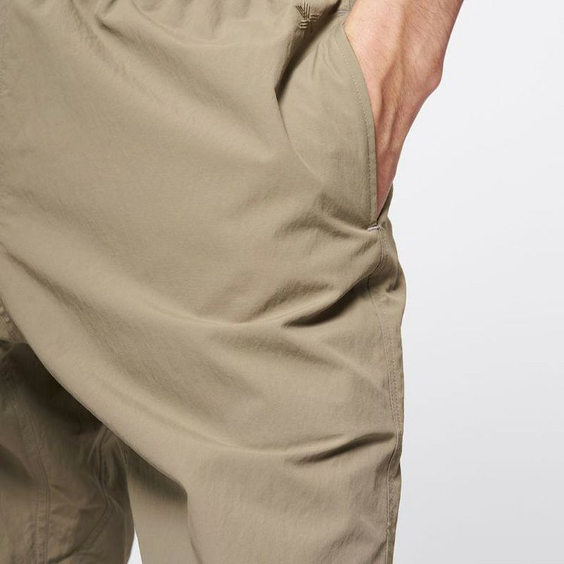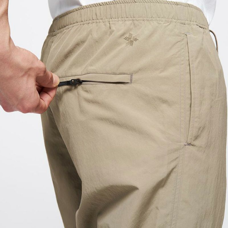 ウエストはゴム+ドローコードで調節でき、フロントの前開きなしのイージー仕様。左右腰には縫い目を利用したポケットを配し、右腰ポケット内にはキーループ付きポケットを配置。