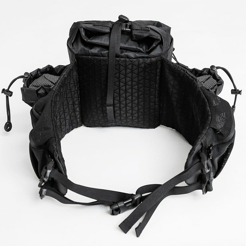 ロールトップのメインスペース、外側にメッシュポケット、2か所のボトルポケットと2つのファスナーポケットが備わっています。ボトルポケットはダブルコードロックを採用しているため、コードで2か所の固定が可能。走っている際もボトルの揺れを抑えます。