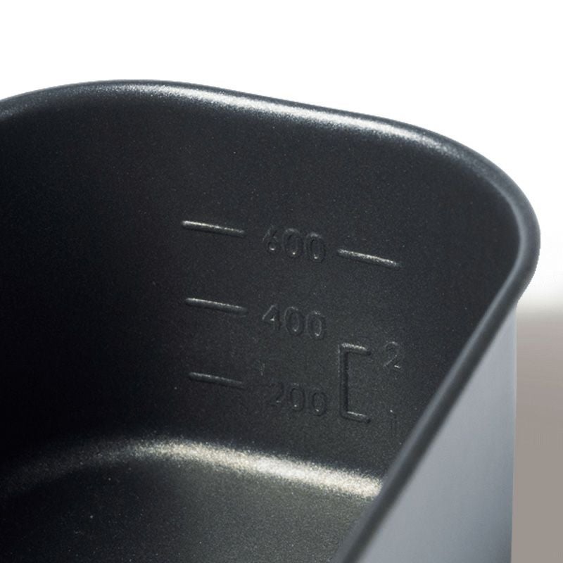 素材は1mm厚のアルミを使用し、手入れの簡単なフッ素樹脂コーティングを施しています。深なべの容量は実用600ml(満水900ml)で目盛りは200ml刻みで600mlまで表示。