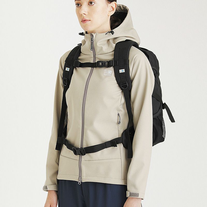 ストックを携行できるポールキャリアを備えています。また、チェストストラップも設け、山行時にフィット感を高めています。