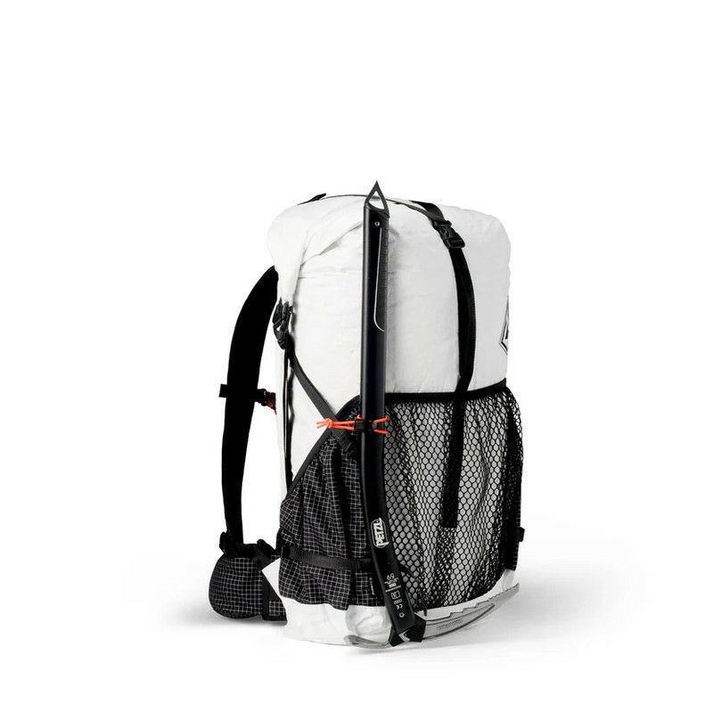 ダイニーマ素材の外部ポケットが側面に2つ、メッシュポケットが背面に1つ。