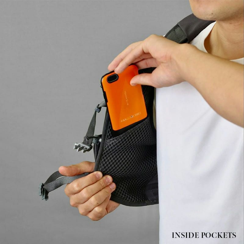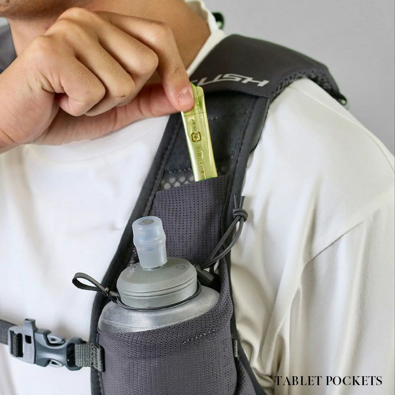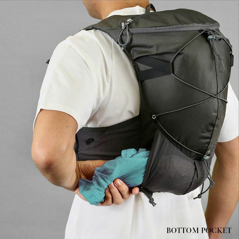 600ccまでのソフトフラスクと500ccのペットボトルが収納できるボトルポケット。新設計のドローコードは片手での操作が可能です。