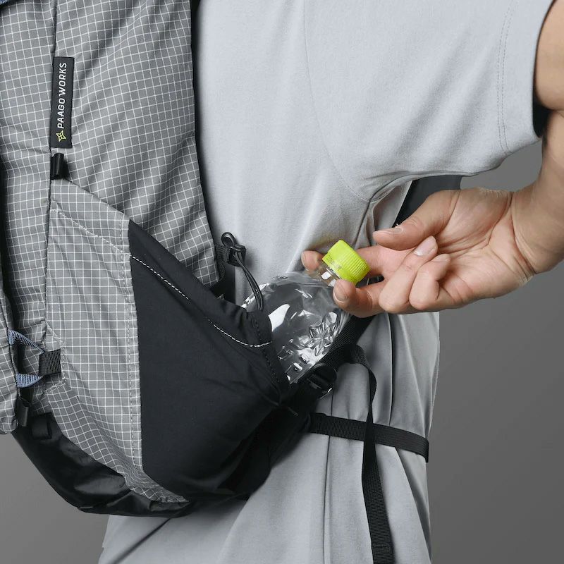 大型のサイドポケットは500mlのボトルが入る設計です。背負った状態でも出し入れでき、かつ不意に脱落しない構造です。耐摩擦性の高いストレッチ素材を採用しています。
