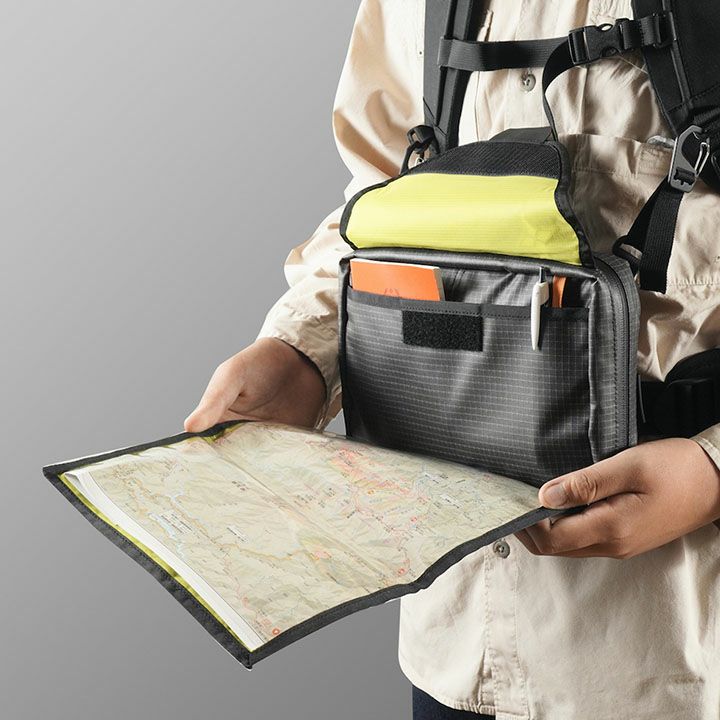 パスファインダーの最大の特徴は、行動中に必要なものを身体の前に持てることです。前面にはA4サイズのマップポケットを装備し、山地図とコンパスで素早く現在地を確認できます。