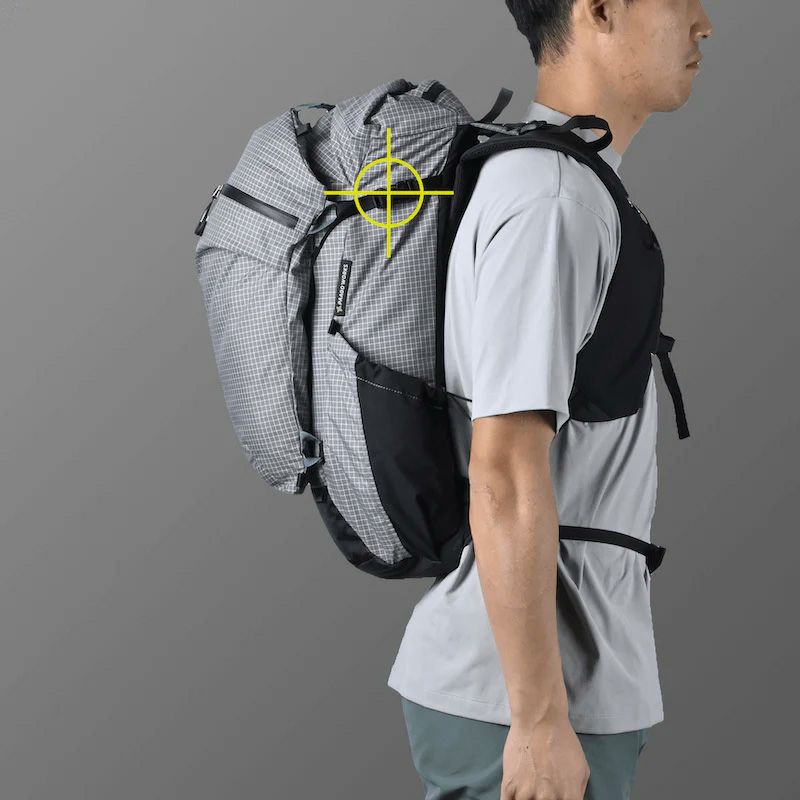 標準的なバックパックよりもショルダーハーネスの支点を低くすることで、ショルダーの有効長と柔軟性を確保し、高いフィット感を実現しました。トップスタビライザーでバッグの荷重を身体側に寄せてもフィット感は変わりません。