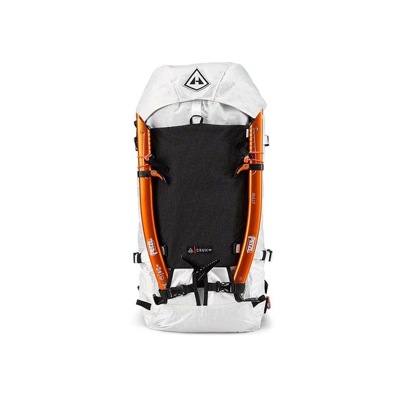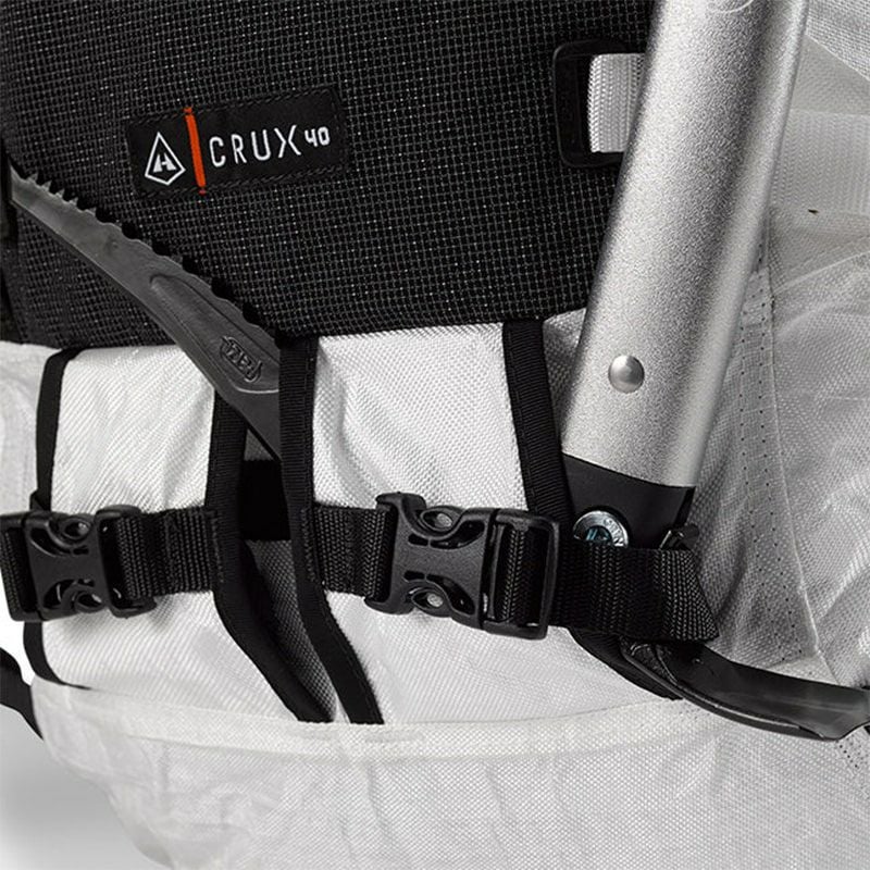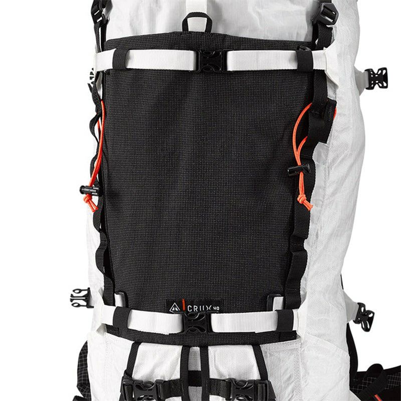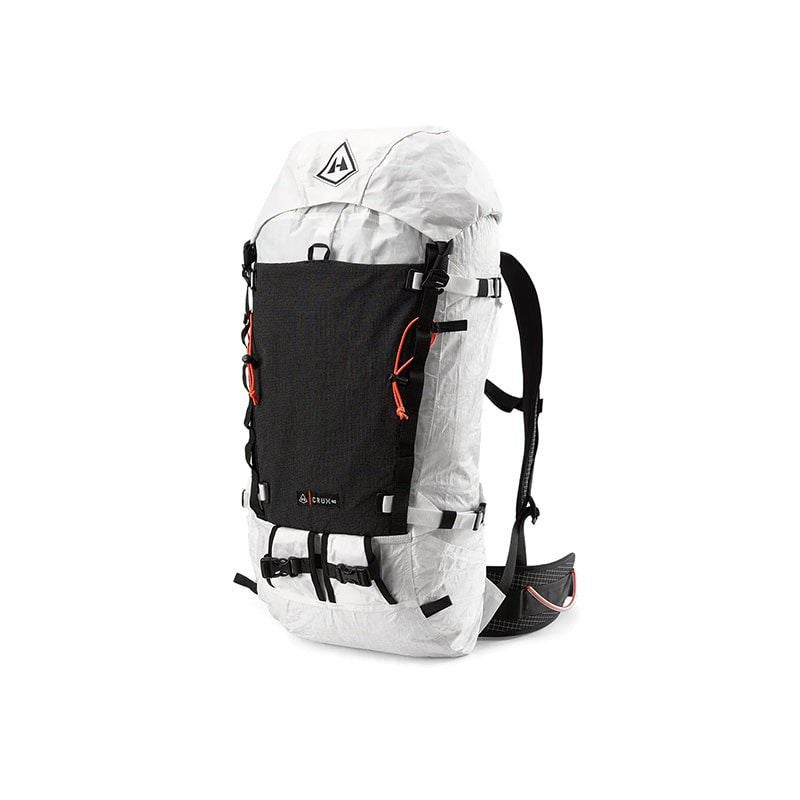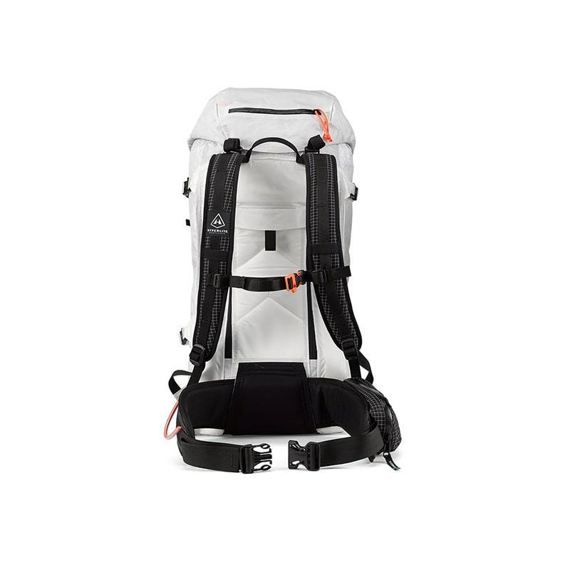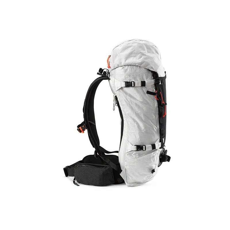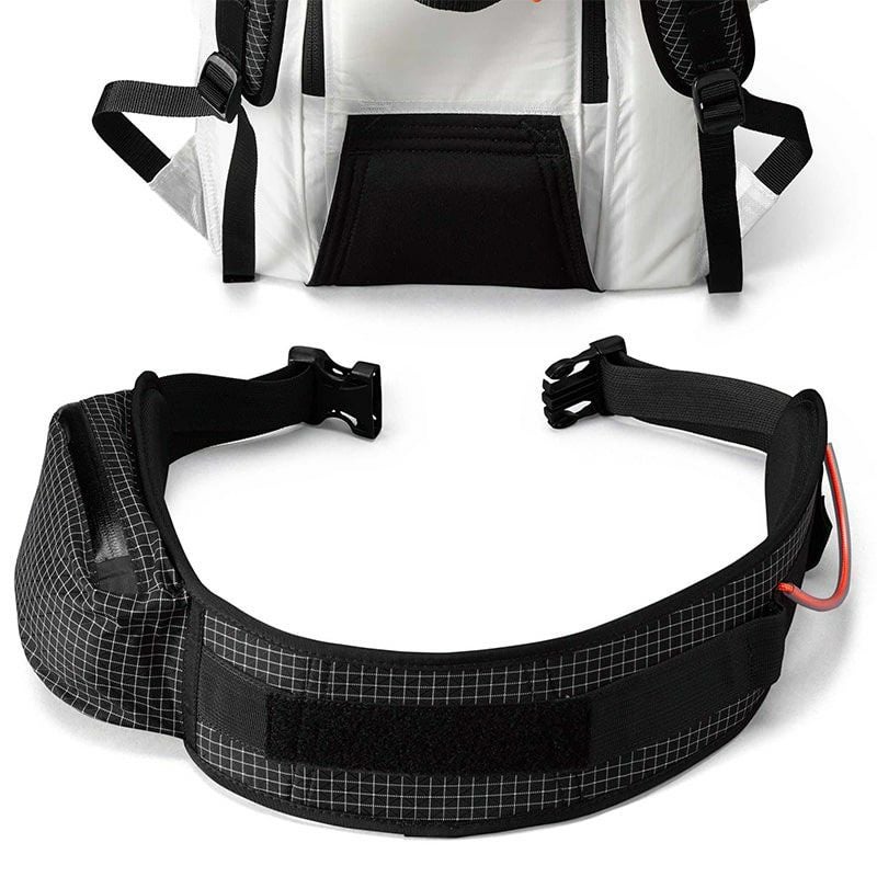 着用者の右側にギアループとアイスクリッパースロットを備えた取り外し可能なヒップベルト、左側にジッパー付きポケットがあります。Dyneema® を使用した Hardline、二重密度 1/8 インチ独立気泡硬質フォーム、1/4 インチ独立気泡フォーム、スペーサー メッシュを使用。
