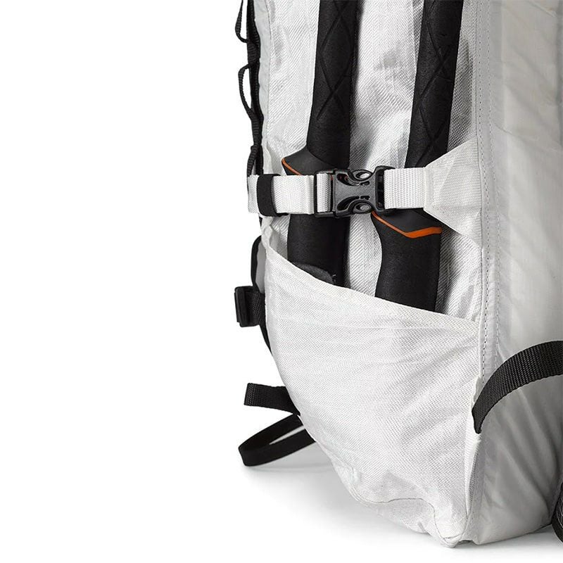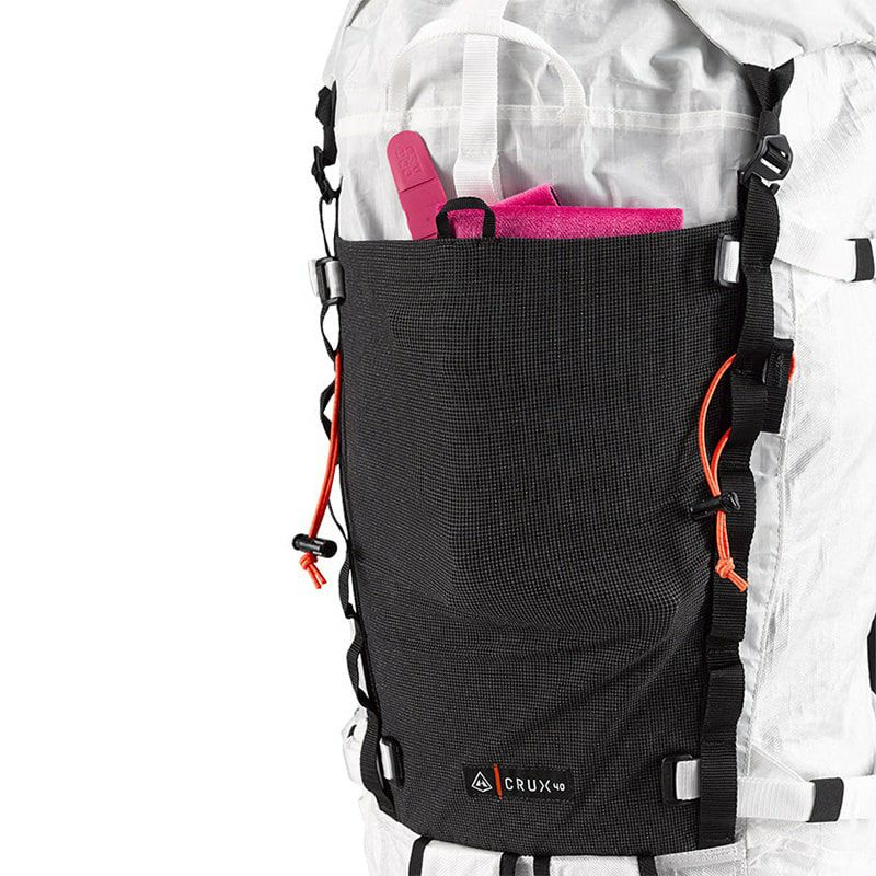 目立たないサイドスリーブポケットには登山用の杖やピケット等を収納できます。フロント Dyneema® ストレッチメッシュ UL フロントポケット