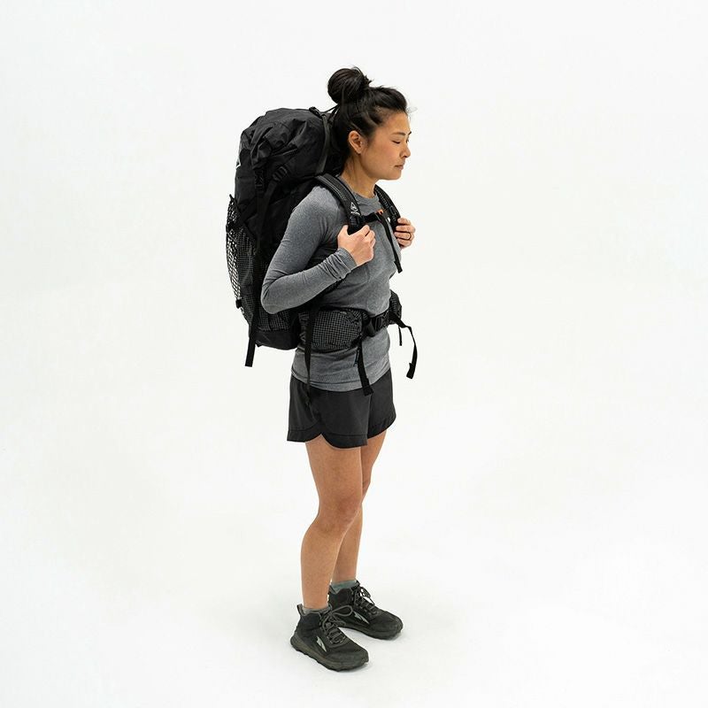1/8 インチクローズドセル硬質フォーム、1/4 インチクローズドセルフォーム、スペーサーメッシュを備えた Dyneema® 二重密度ヒップベルトを備えたハードライン。