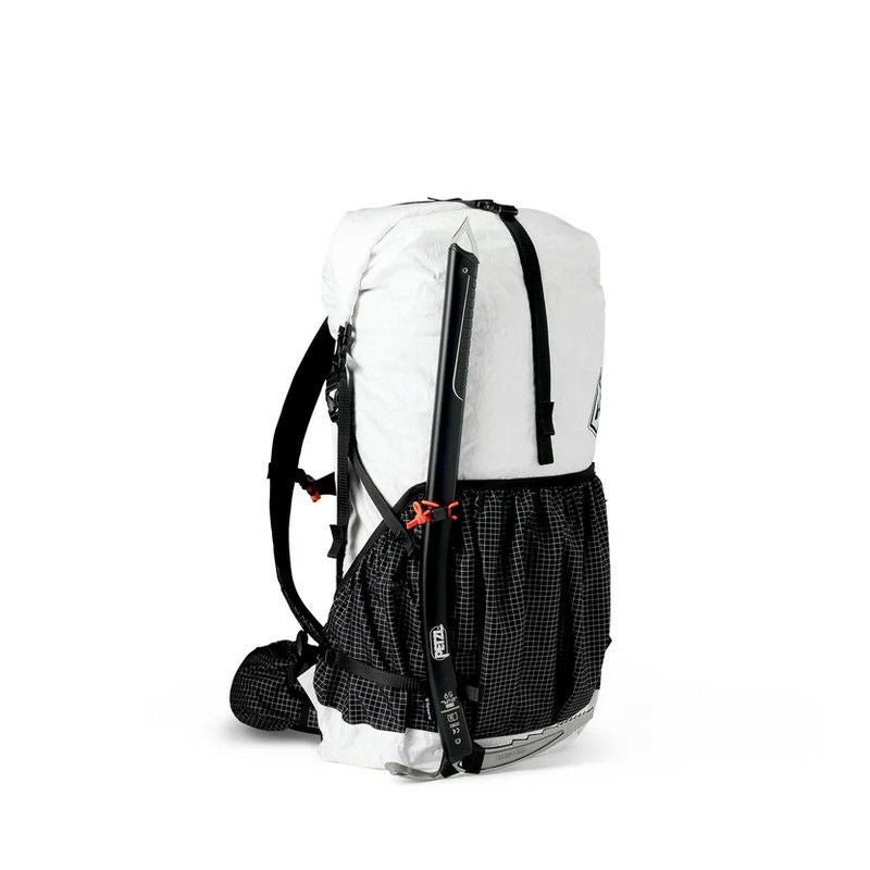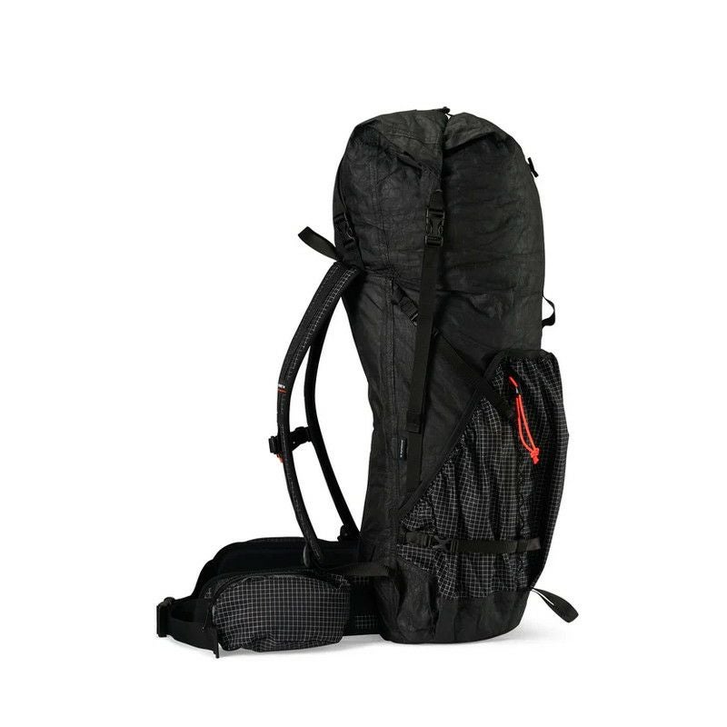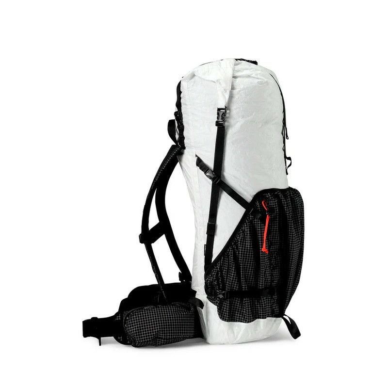 岩や枝に擦れても破れにくい外部ポケットは、ハイカーの動線を考え抜いた配置。 背面のアルミステーやハイドレーション、完全防水構造など、細部まで機能美が詰まったモデルです。