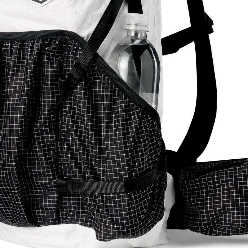 外側には、耐摩耗性に優れたダイニーマ生地を使用した3つの大型ポケットを配置。 フロントポケットは地図やレインウェアを素早く取り出せる実用的な設計で、両サイドポケットはボトルやスタッフサックの収納に最適です。 岩場などのハードな環境でも安心して使える、高い耐久性を備えています。
