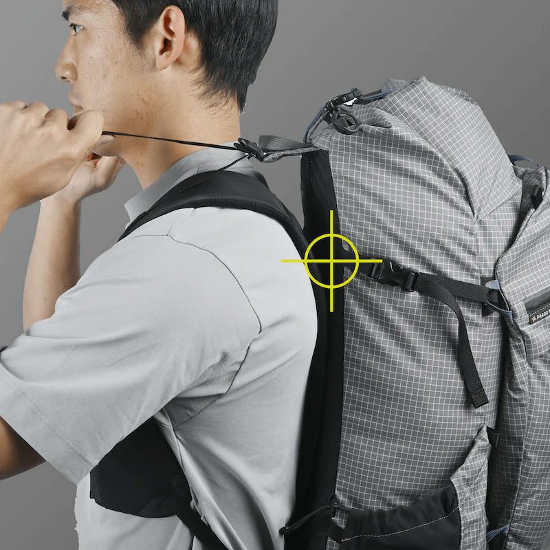 標準的なバックパックよりもショルダーハーネスの支点を低くすることで、ショルダーの有効長と柔軟性を確保し、高いフィット感を実現しました。トップスタビライザーでバッグの荷重を身体側に寄せてもフィット感は変わりません。