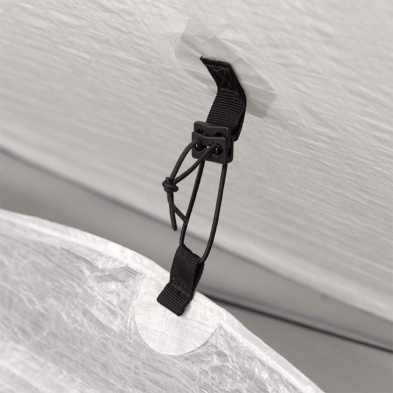 交換が可能な前室ドアのタイアウトポイント。DCF11で補強されたライナーロック付きの6つのタイアウトがあります。さらに2つの後部ミッドパネルタイアウト、2つのサイドミッドパネルタイアウト、1つのアペックスタイアウトによってテントの構造を強化し、風などによる影響を軽減します。